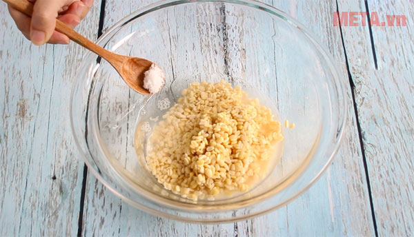 Đậu xanh ngâm trước một đêm. Cho vào tô thêm ½ thìa cà phê muối rồi đổ nước xâm xấp mặt. Bọc màng thực phẩm cho vào lò vi sóng, bật chế độ High quay trong 6 phút.
