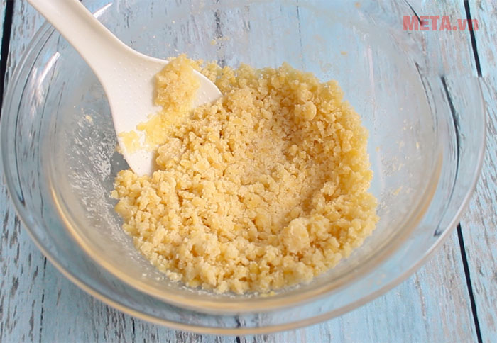 Lấy ra, xới sơ rồi cho vào lò vi sóng, bật chế độ High quay thêm 6 phút. Lấy ra cho vào 40g đường, trộn và tán nhuyễn đậu xanh.