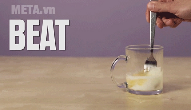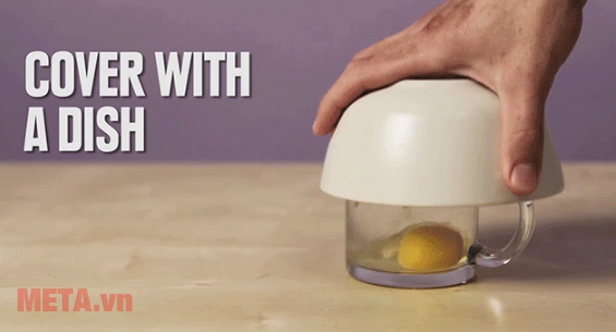 - Đậy lên cốc trứng này một cái bát để che kín mặt cốc. Sau đó, đặt vào lò vi sóng quay trong 50 giây ở nhiệt độ cao nhất (đảm bảo vật thể cho vào lò vi sóng bắng sứ hoặc thủy tinh trơn không hoa văn nhé)