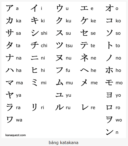 Bảng chữ cái tiếng Nhật Katakana là bảng chữ cái được sử dụng phổ biến nhất, công dụng chủ yếu thường là để phiên âm lại các từ tiếng nước ngoài (không phải tiếng Nhật). Tuy nhiên, các cách phát âm trong tiếng Nhật lại không được linh hoạt như những ngôn ngữ khác, nên những từ được phiên âm bằng Katakana thường không có cách phát âm giống với từ ban đầu. Một khi bạn đã quen với nó, bạn sẽ không chỉ hiểu được những từ nước ngoài đã được Nhật hóa, mà còn biết cách phát âm những từ nước ngoài sử dụng các âm trong tiếng Nhật.
