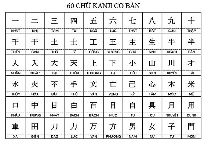 Hiện nay, trong từ điển chữ Hán có khoảng 50.000 chữ Kanji. Tuy nhiên với những người học tiếng Nhật chỉ cần biết khoảng 2000 chữ Kanji thông dụng là đã đủ để giao tiếp và làm việc một cách chuyên nghiệp rồi. Những chữ cái Kanji mà chúng ta cần học là những chữ được sử dụng rộng rãi trong đời sống và sinh hoạt hàng ngày, trong cả công việc, học tập và giao tiếp thông thường. Dưới đây là bảng chữ cái Kanji cơ bản nhất cho người mới bắt đầu: