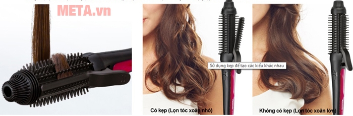 - Cho một lượng tóc vừa đủ để cuốn vào lõi máy. Bạn cũng cuốn từ ngọn tóc lên đến điểm cần làm xoăn (làm tương tự như với lô cuốn tóc, được hướng dẫn cụ thể ở trên). Lõi máy Panasonic EH-HT45-K645 được thiết kế dạng lược tròn và các răng của lược điện sẽ nhẹ nhàng cuốn và đan vào tóc của bạn. Phần kẹp giữ nếp sẽ giúp lượng tóc cần uốn được chặt và chắc chắn hơn.