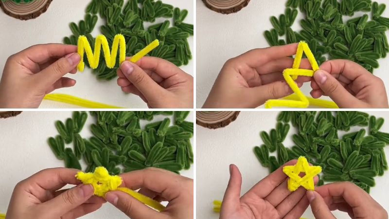 - Gấp 6 đoạn kẽm nhung màu vàng sao cho bằng nhau rồi uốn thành hình hình ngôi sao năm cánh.