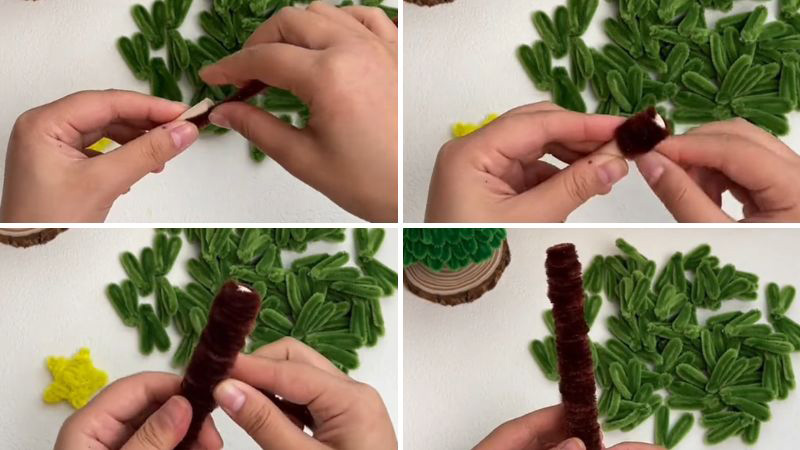 - Tiếp theo, bạn quấn kẽm nhung nâu quanh phần thân ống hút để làm thân cây rồi dán phần cuối đoạn kẽm vào cuối cây ống hút.