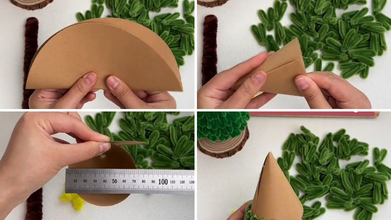 - Phần giấy bìa cứng, bạn cắt thành nửa hình tròn, cuốn nửa hình tròn thành hình chóp nón với đường kính khoảng 7cm.