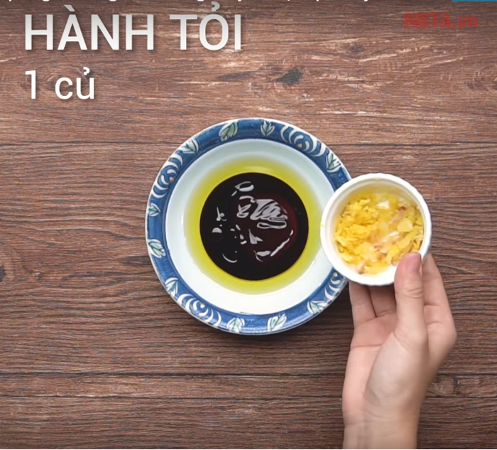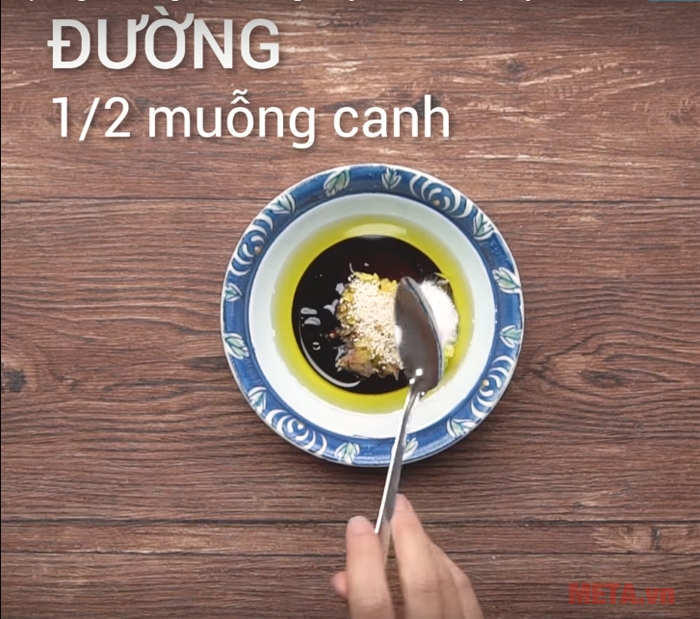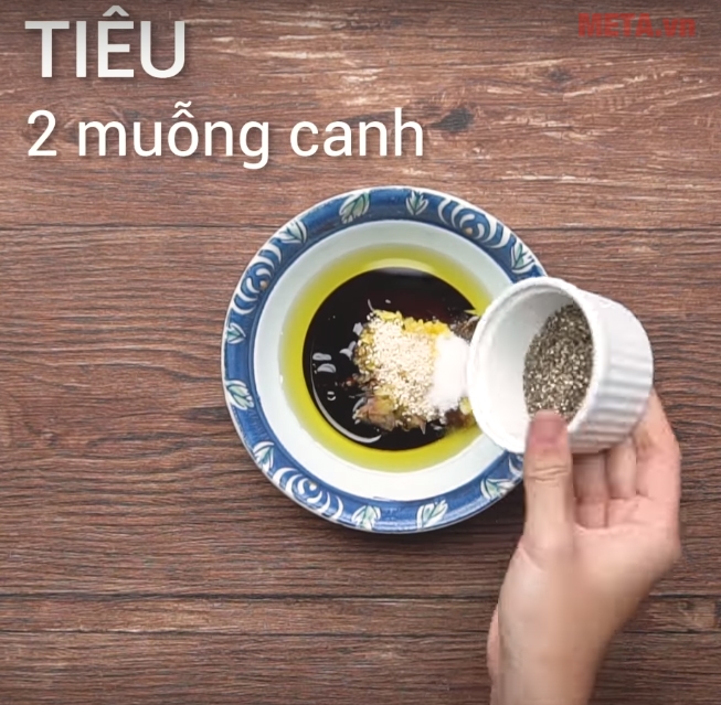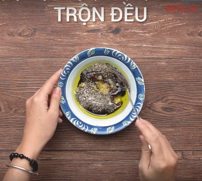 Bước 1: Pha nước sốt: Trộn đều 2 muỗng canh dầu ô liu, 2 muỗng canh nước tương, 2 muỗng canh dầu hào, hành tỏi băm, 1/4 muỗng canh muối, 1/2 muỗng canh đường, 1/2 muỗng canh hạt nêm, 2 muỗng canh tiêu.