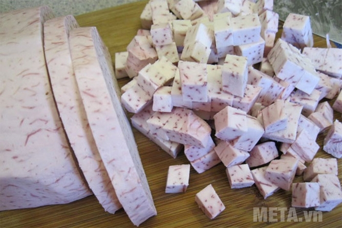 Cắt nhỏ khoai môn để quá trình nghiền nhuyễn được dễ dàng hơn