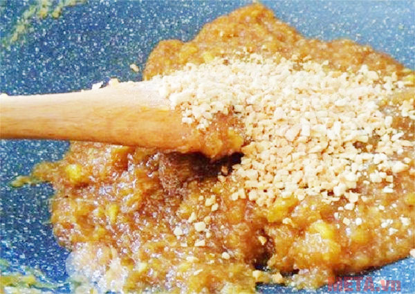 Khi thấy hỗn hợp kẹo đã trở thành một khối dẻo mịn, không bám dính vào thành nồi và đáy nồi nữa thì bạn cho phần lạc rang giã dập + dừa tươi nạo sợi + gừng tươi + bơ thực vật vào khuấy đều kỹ. Tiếp tục sên thêm chừng 10 phút nữa thì tắt bếp.