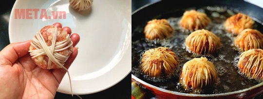 Bước 5: Lấy sợi mì trứng rồi cuộn đều vào từng viên tôm thịt. Tiếp đó đun nóng dầu ăn trong chảo, cho mì bọc tôm thịt viên vào chiên cho đến khi chín vàng đều là được.
