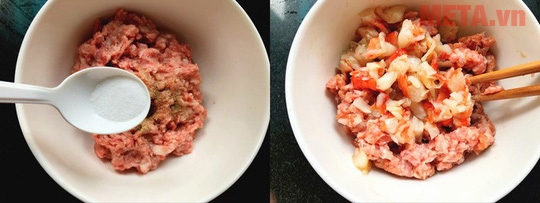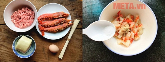 Bước 2: Cho phần rượu còn lại vào bát thịt xay cùng 7ml nước tương, chút muối, hạt tiêu rồi trộn đều. Sau đó thêm tôm vào trộn chung.