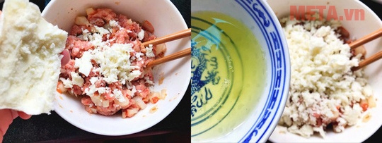 Bước 3: Xé vụn bánh bao chay rồi cho vào tô tôm thịt, thêm lòng trắng trứng vào trộn đều.