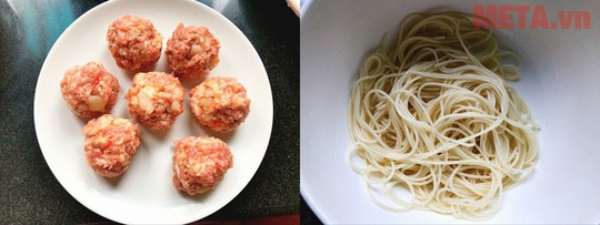 Bước 4: Viên tôm thịt thành từng viên tròn nhỏ. Đun sôi một nồi nước, cho mì trứng vào luộc chín rồi vớt ra để ráo nước.