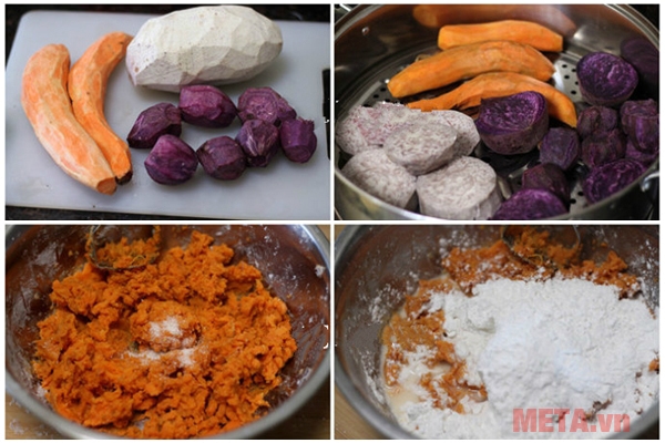 Khoai môn, khoai lang, khoai lang tím sau khi gọt vỏ thì cho vào nồi hấp chín (khoảng 20 - 30 phút). Tiếp đến, cho khoai ra tô nghiền nhuyễn riêng từng loại (Vì khoai sau khi nghiền rất dễ kết dính vào nhau, để tạo nên tính thẩm mỹ cho món chè thì bạn nên để riêng ra từng tô nhé!).