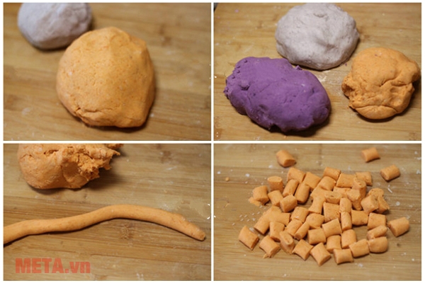 Lúc này, bạn sẽ có ba tô bột với ba màu sắc khác nhau. Lăn riêng từng viên bột thành đoạn thuôn dài rồi cắt khúc tầm 1cm - 1,5cm (vừa miệng ăn vừa đẹp mắt).