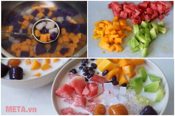 Xắt các miếng trái cây thành từng miếng nhỏ và cho vào trong mỗi chén chè. Rồi tiếp đến, đừng quên cho các miếng khoai đủ màu sắc vào nhé!