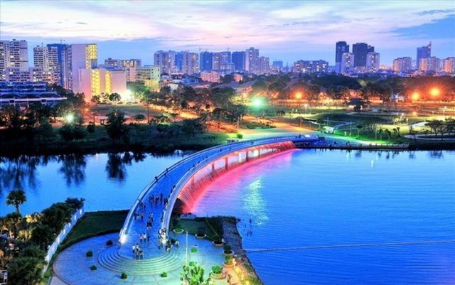 Mỗi khi nhắc đến địa điểm chụp hình đẹp ở Sài Gòn thì không thể không nhắc đến Cầu Ánh sao. Nơi đây được nhiều bạn ví là “Dải ngân hà dưới bầu trời đêm thành phố”, không chỉ là địa điểm vui chơi lý tưởng mà còn là nơi dành cho những tín đồ đam mê "sống ảo" nữa. Cầu Ánh sao ban ngày mang vẻ đẹp hiện đại với hệ thống phun nước dọc hai bên cầu, về đêm lại được thắp sáng lung linh nhờ những dải đèn LED nhiều màu khiến cho cây cầu trở nên thật lấp lánh, thơ mộng. Ngoài ra, khi đến Cầu Ánh sao ban ngày, bạn còn được check-in tại Hồ bán nguyệt xinh lung linh gần đó nữa.