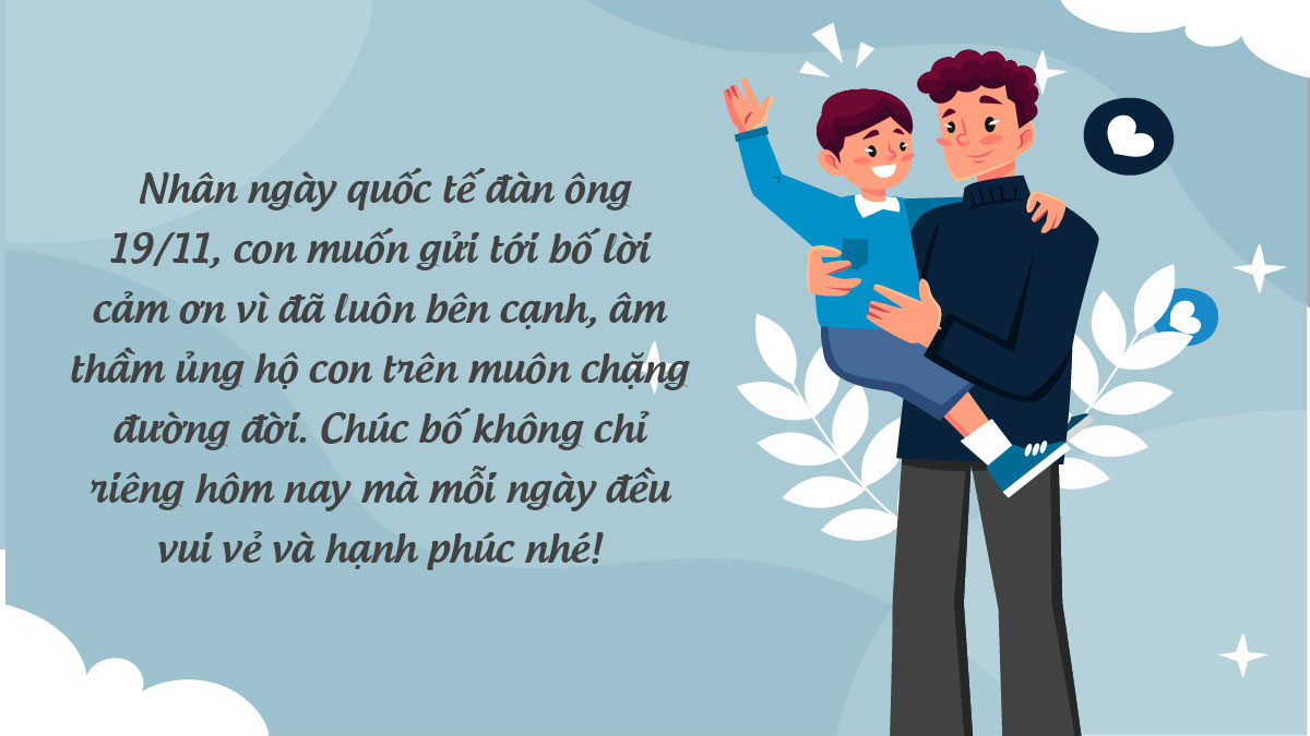 - Chúc bố yêu của con có một Ngày Quốc tế Nam giới thật vui vẻ, hạnh phúc. Con luôn tự hào vì được làm con của bố. Con yêu bố rất nhiều!
