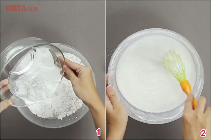 - Bạn cần đổ bột gạo, bột năng, nước, thêm một muỗng canh dầu ăn vào tô lớn.