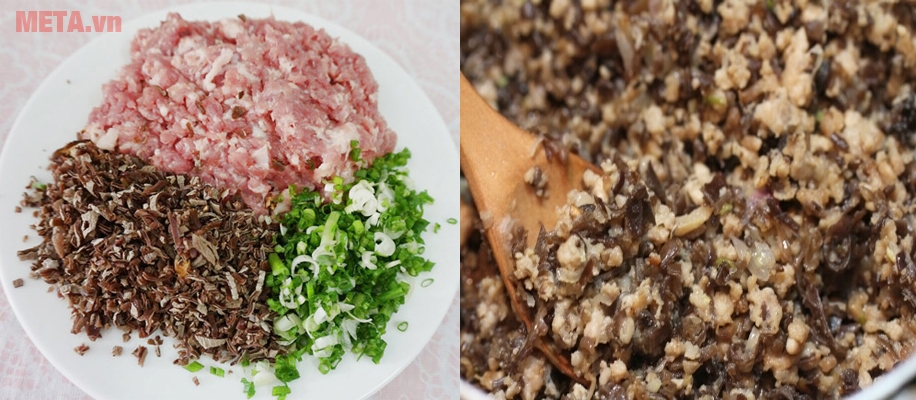 - Bạn cần đổ 1 muỗng canh dầu ăn vào chảo nóng, thêm chút hành tím phi cho thơm rồi cho tiếp thịt xay, mộc nhĩ và một ít bột nêm.