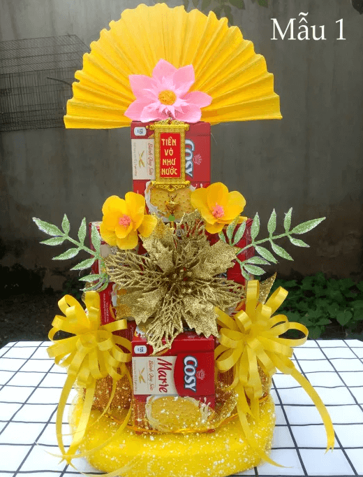 Các mẫu tháp bánh tài lộc dưới đây không chỉ đẹp mà còn đơn giản, dễ làm. Bạn chỉ cần chuẩn bị những vật liệu như hộp bánh ChocoPie, hoặc bánh Cosi, Custard...; súng bắn keo; đồ trang trí…