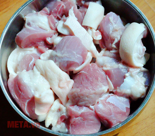 Chọn miếng thịt chân giò vì thịt chân giò khi chế biến sẽ tạo ra nhiều chất kết dính cho món ăn. Ngoài ra, bạn có thể thêm ít bì heo nấu cùng, bì heo cũng tạo ra chất kết dính như móng giò. Lưu ý: khi nấu xong, bạn vớt bỏ bì heo ra là được.