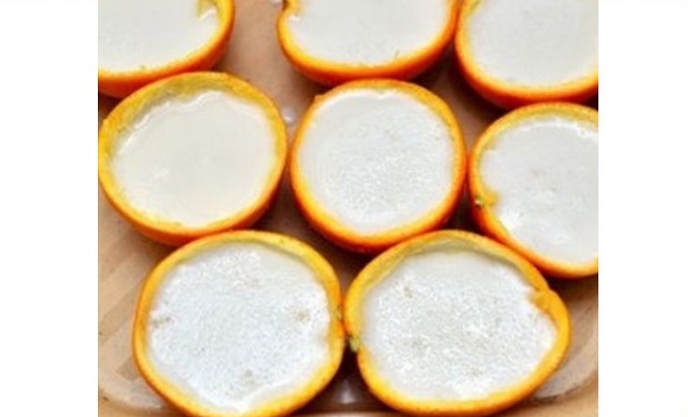 Đổ phần nước rau câu ở trên vào 1/2 vỏ cam đã chuẩn bị sẵn, sau đó đặt vào trong ngăn mát tủ lạnh 2 - 3 tiếng để rau câu đông lại.