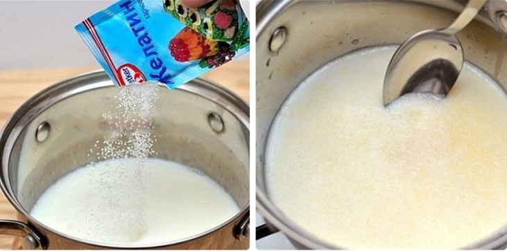 Sau đó đặt nồi hỗn hợp gelatin này lên bếp, đun với lửa nhỏ trong khoảng 5 phút, vừa đun vừa khuấy đều để gelatin tan hoàn toàn. Sau đó tắt bếp, để yên cho nước rau câu nguội bớt rồi cho 230ml kem whipping vào, khuấy đều cho hòa quyện với nước rau câu.
