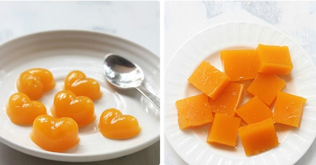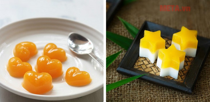 Từng miếng rau câu hình trái tim căng mọng với màu vàng từ nguyên liệu xoài sẽ khiến tim chàng phải xao xuyến.