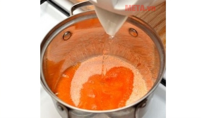 Đổ bột agar ra tô, trộn đều với đường cát. Sau đó, đổ hoàn toàn phần nước lọc vào, khuấy đều cho hỗn hợp tan ra. Tiếp đến bắc nồi lên bếp và đun sôi, vẫn khuấy đều tay, vớt bọt liên tục cho đến khi hỗn hợp rau câu trong màu.