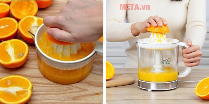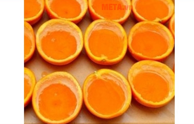 Cam rửa sạch, cắt thành 2 nửa bằng nhau rồi ép lấy nước. Bạn có thể sử dụng máy vắt cam để lấy nước cam được dễ dàng hơn. Nước cam sẽ không dùng đến, chúng ta chỉ lấy vỏ cam để làm khuôn.