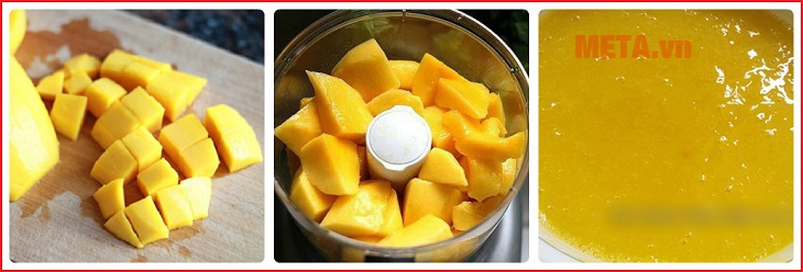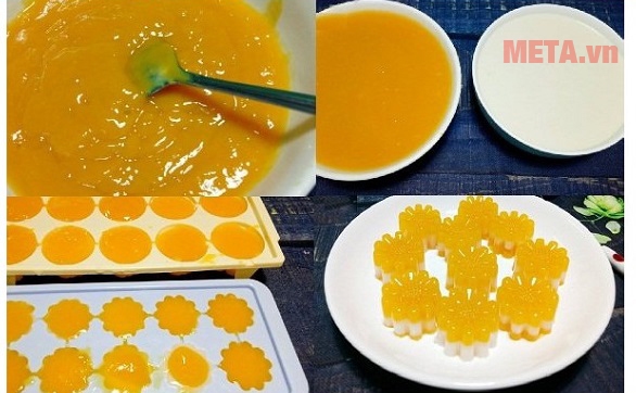 Xoài gọt vỏ, cắt nhỏ cho vào máy xay sinh tố xay nhuyễn mịn rồi lược qua rây. Cho phần xoài đã xay mịn vào hỗn hợp bột rau câu ở trên, khuấy đều tay cho hỗn hợp được trộn đều.