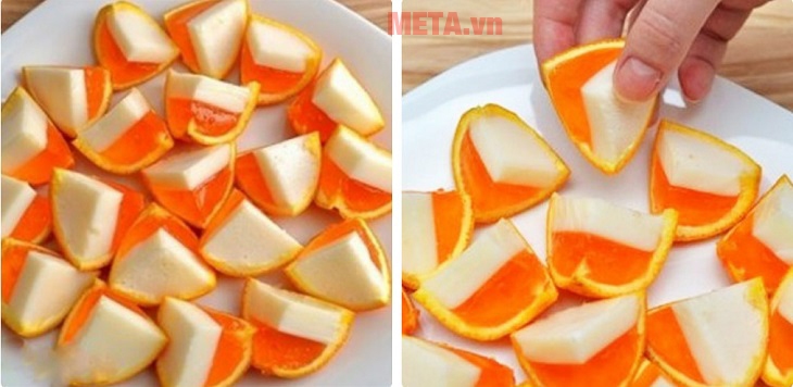 Món rau câu cam dẻo 2 tầng có hình thức như miếng cam rất đẹp mắt, phần rau câu cam thanh ngọt kết hợp với thạch sữa dừa ngậy béo chắc chắn sẽ khiến người yêu của bạn bất ngờ vì tài nấu nướng của bạn đấy!