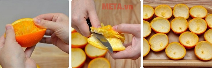 Lộn ngược vỏ cam đã vắt hết nước lại rồi dùng dao để tách bỏ phần xác. Sau đó lộn vỏ cam trở lại hình dạng ban đầu (bước này bạn phải làm thật nhẹ nhàng để tránh bị gãy, thủng vỏ cam).